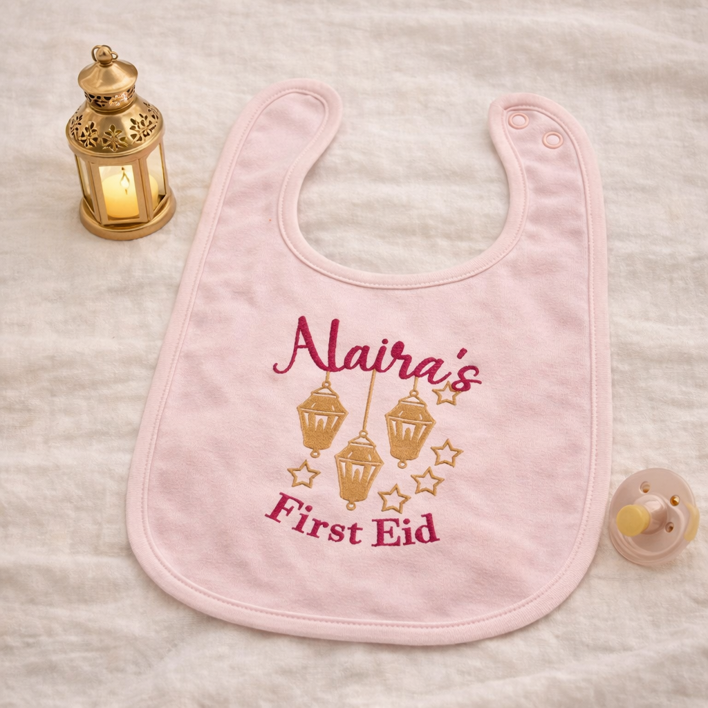 Order your 'My First Eid' bib today and add a touch of boutique quality to your little one's special day!